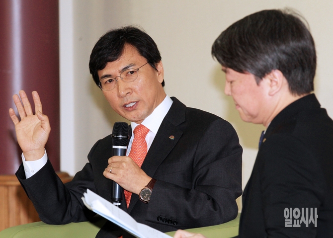 안희정 충남도지사가 안철수 새정치민주연합 의원과 25일 오전 서울 여의도 국회의원회관에서 열린 '경제성장을 위한 복지투자' 좌담회를 진행하고 있다.