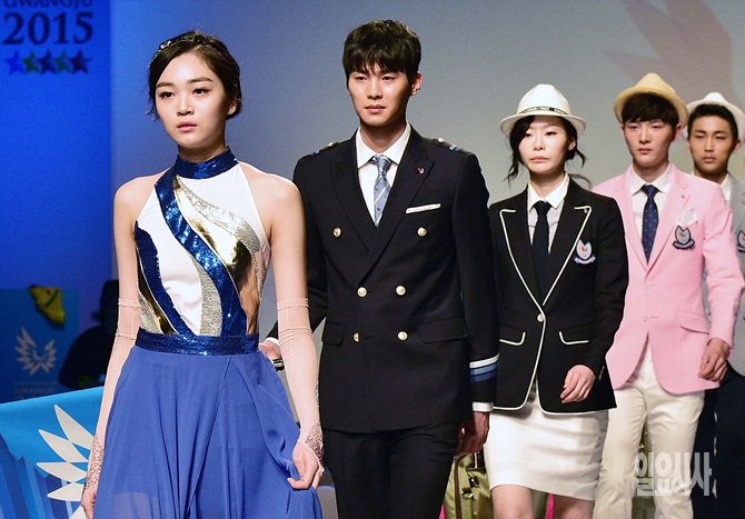 2015광주하계유니버시아드 조직위원회가 25일, 서울 신라호텔 다이너스티홀에서 ‘광주U대회 D-100일’을 기념해 유니폼 패션쇼를 개최한 가운데, 모델들이 워킹을 하고 있다.