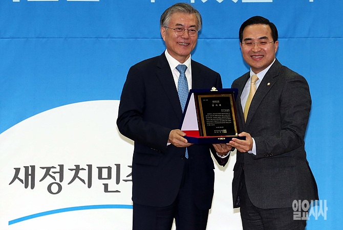26일, 서울 여의도 국회 의원회관에서 열린 새정치민주연합 1주년 기념식에서 박홍근 의원이 문재인 대표로부터 감사패를 받고 있다.