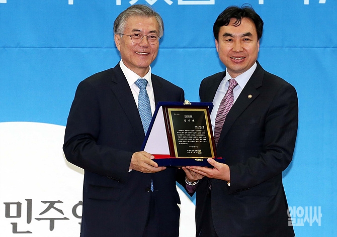 26일, 서울 여의도 국회 의원회관에서 열린 새정치민주연합 1주년 기념식에서 윤관석 원내대변인이 문재인 대표로부터 감사패를 수여받고 있다.