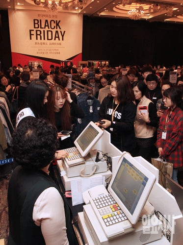27일 오전 서울 소공동 롯데호텔 2층 크리스탈볼룸에서 열린 '롯데백화점 2015 블랙 프라이데이'행사에서 시민들이 상품을 구매하고 있다. 이번 행사에서는 잡화, 여성패션, 남성패션, 식품, 가정 등 전 상품군에서 총 150여개 브랜드가 참여, 120억원 물량의 상품을 50~80% 할인 판매한다.