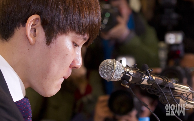수영선수 박태환이 27일 오후 서울 송파구 잠실관광호텔에서 기자회견을 열고 약물징계 관련 입장을 발표하면서 울먹이고 있다.