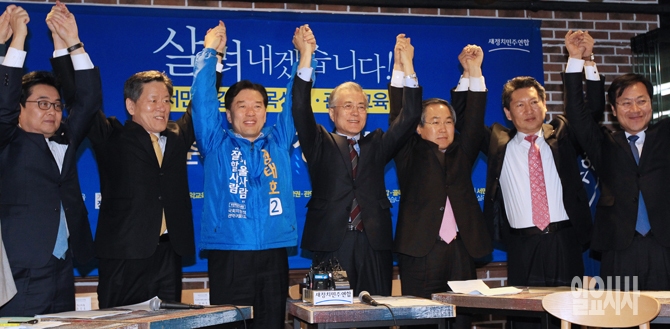 새정치민주연합 문재인 대표, 우윤근 원내대표, 4·29재보궐선거 서울 관악을에 출마한 정태호 예비후보 등이 30일 오전 서울 관악구 난곡로 난향꿈둥지에서 열린 현장최고위원회의에서 선전을 다짐하고 있다.