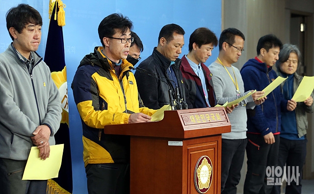 세월호1주기를 앞둔 30일, 세월호 유가족들이 서울 여의도 국회 정론관에서 기자회견을 갖고 있다.