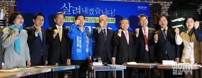 새정치민주연합 문재인 대표, 우윤근 원내대표, 4·29재보궐선거 서울 관악을에 출마한 정태호 예비후보 등이 30일 오전 서울 관악구 난곡로 난향꿈둥지에서 열린 현장최고위원회의에서 선전을 다짐하고 있다.