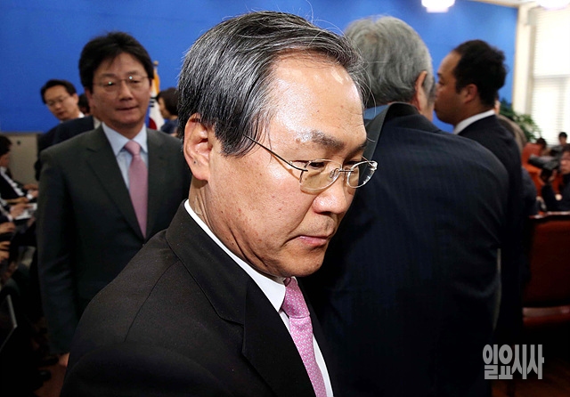 30일, 서울 여의도 국회에서 열린 여야 주례회동 직후, 새정치민주연합 우윤근 원내대표가 수심이 가득한 얼굴로 퇴장하고 있다.