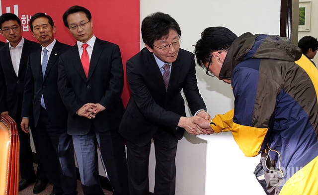 31일, 서울 여의도 국회 새누리당 원내대표실에서 전명선 세월호 가족협의회 운영위원장과 새누리당 유승민 원내대표가 악수를 나누고 있다.