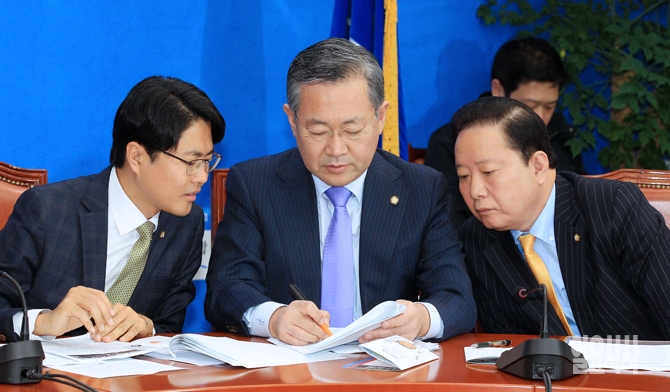 새정치민주연합 김광진, 박남춘, 유대운 의원이  31일 오전 서울 여의도 국회에서 열린 원내대책회의에서 논의하고 있다.