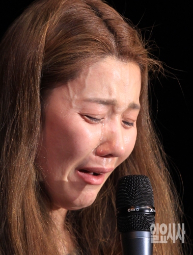 소울샵 엔터테인먼트와 전속 계약 분쟁중인 가수 길건이 31일 오후 서울 종로구 동숭동 유니플렉스에서 기자회견 중 눈물을 흘리고 있다.