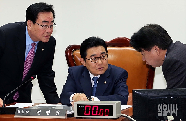 31일, 서울 여의도 국회에서 열린 국민안전혁신 특별위원회 전체회의 도중 전병헌 특위위원장(사진 가운데)과 김태원(사진 왼쪽)·노웅래 여야 간사가 이야기를 나누고 있다.