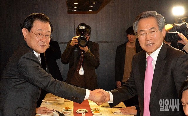 1일, 서울 여의도 모처의 한 식당에서 열린 새정치민주연합 지도부와 대통령 참모진 오찬회동 직전, 우윤근 원내대표와 이병기 대통령 비서실장이 악수를 나누고 있다.