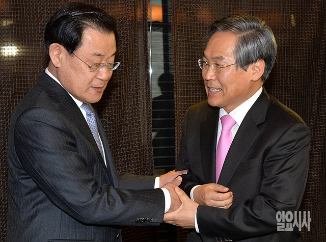 1일, 서울 여의도 모처의 한 식당에서 열린 새정치민주연합 지도부와 대통령 참모진 오찬회동 직전, 우윤근 원내대표와 이병기 대통령 비서실장이 악수를 나누고 있다.