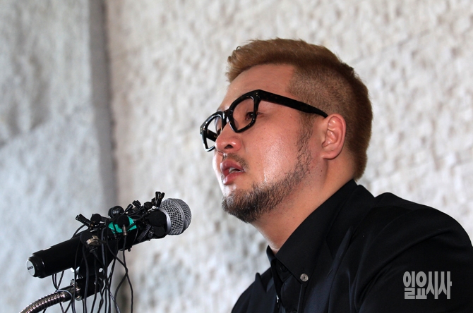 가수 길건과 전속계약 분쟁 중인 소울샵 엔터테인먼트 대표 김태우가 1일 오후 서울 서초구 반포동 가빛섬에서 기자회견 도중 눈물을 흘리고 있다.