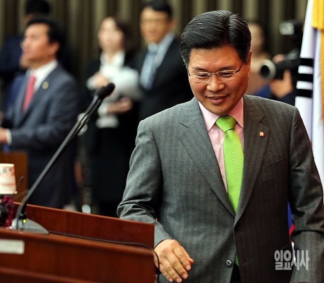 1일, 서울 여의도 국회에서 열린 새누리당 정책의총장에 홍문종 의원이 공개발언을 위해 단상으로 나가고 있다.