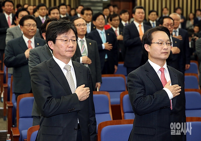 1일, 서울 여의도 국회서 열린 새누리당 정책의총 직전, 유승민 원내대표-조해진 원내수석부대표가 국기에 대한 경례를 하고 있다.