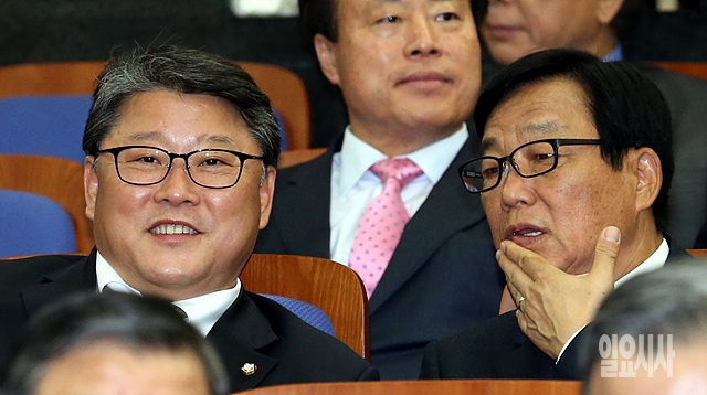 1일, 서울 여의도 국회서 열린 새누리당 정책의총에서 조원진-이종진 의원이 이야기를 나누고 있다.