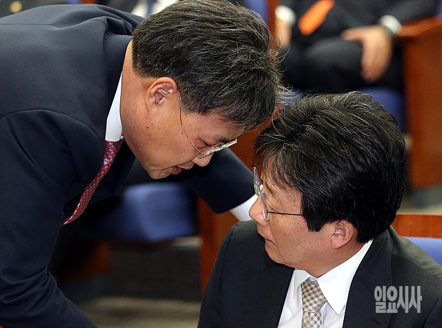 1일, 서울 여의도 국회서 열린 새누리당 정책의총에서 유승민 원내대표가 정문헌 국회 정치개혁 특별위원회 여당 간사와 논의를 하고 있다.