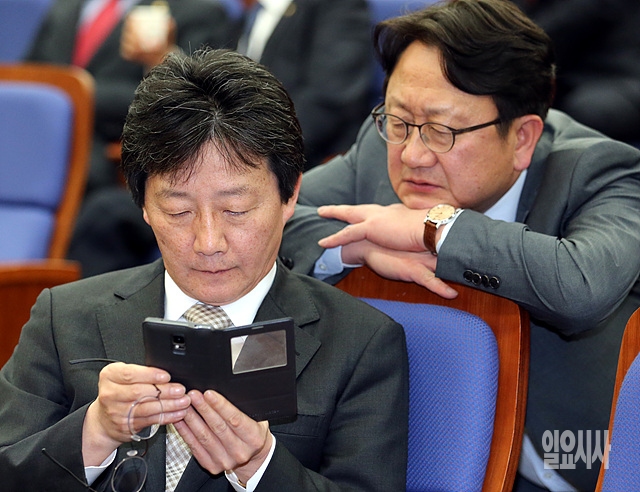 1일, 서울 여의도 국회서 열린 새누리당 정책의총 도중 유승민 원내대표가 자신의 스마트폰을 확인하고 있다.