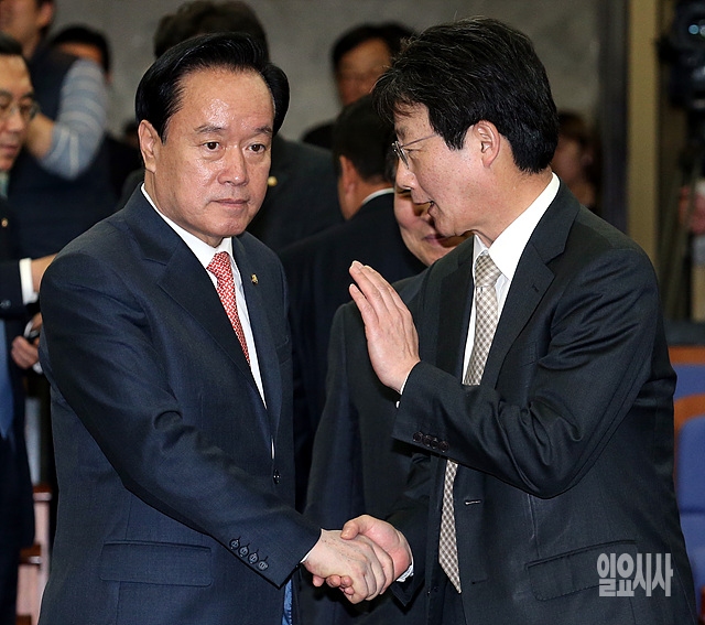 1일, 서울 여의도 국회서 열린 새누리당 정책의총에서 유승민 원내대표가 이병석 국회 정치개혁특위 위원장과 악수를 나누고 있다.