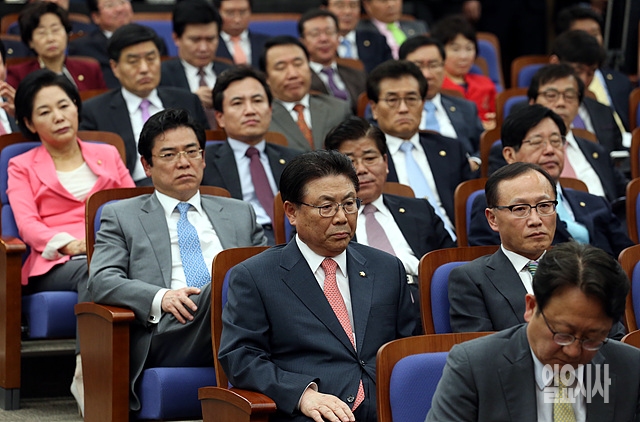 1일, 서울 여의도 국회서 열린 새누리당 정책의총에 출석한 의원들이 다소 심각한 표정들을 짓고 있다.