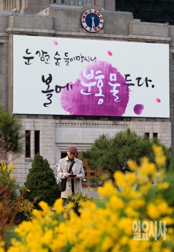 한 차례 봄비가 내린 이후 완연한 봄날씨를 보인 1일 오후 서울광장에서 한 시민이 ‘눈 감고 숨 들이마시니 볼에 분홍 물든다’라는 서울도서관 꿈새김판 앞에서 휴대전화로 꽃을 촬영하고 있다.