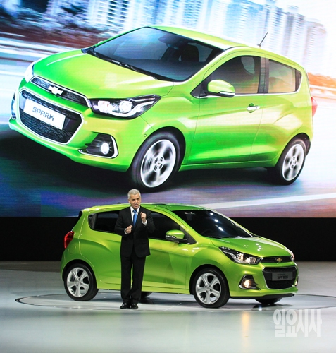 2일 오전 경기도 일산 킨텍스에서 열린 '2015 서울모터쇼 프레스데이'에서 세르지오 호샤 한국GM 사장 겸 CEO가 차세대 쉐보레 '스파크'를 소개하고 있다. '2015 서울모터쇼'는 2일 프레스데이를 시작으로 오는 12일까지 계속된다.