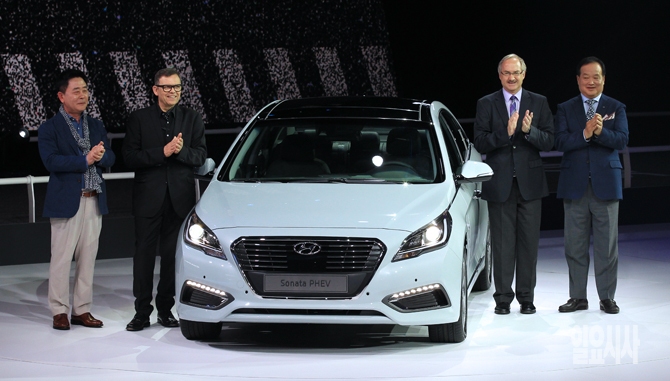 현대자동차가 2일 오전 경기도 일산 킨텍스에서 열린 '2015 서울모터쇼' 언론공개 행사에서 플러그인 하이브리드 '쏘나타 PHEV'를 공개하고 있다. 왼쪽부터 현대자동차 곽진 국내영업본부장, 피터 슈라이어 현대·기아차 디자인 총괄, 울리 슈틸리케 국가대표팀 축구감독, 김충호 대표이사.