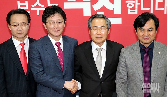 2일, 서울 여의도 국회서 열린 여야 주례회동에서 유승민·우윤근 여야 원내대표가 악수를 나누고 있다.