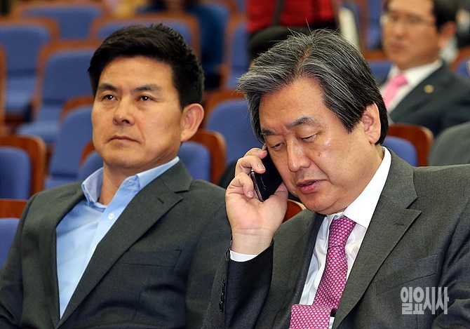 2일, 서울 여의도 국회에서 열린 새누리당 정책 의원총회 도중 김무성 대표가 전화통화를 하고 있는 가운데, 옆 자리의 김태호 의원이 심각한 표정을 짓고 있다.