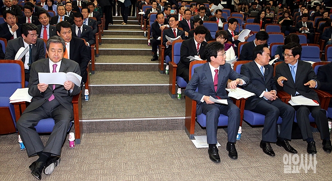 2일, 서울 여의도 국회에서 열린 새누리당 정책 의원총회에서 유승민 원내대표, 이병석 의원, 김문수 보수혁신특별위원장이 함께 앉아 있는 반면, 김무성 대표가 홀로 앉아 발언문을 살피고 있다.