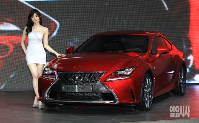 2일 오전 경기도 일산 킨텍스에서 열린 '2015 서울모터쇼' 언론공개 행사에서 레이싱 모델이 '렉서스 RC F 스포츠' 옆에서 포즈를 취하고 있다.
