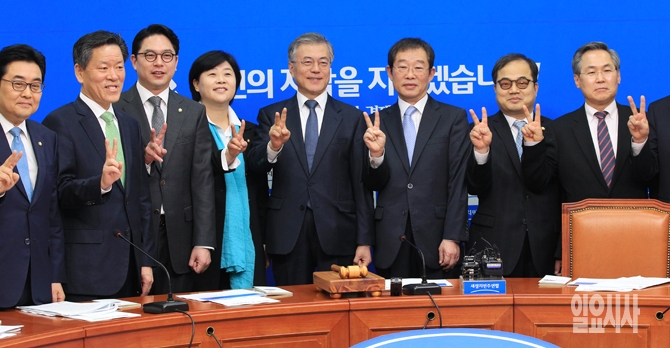 문재인 새정치민주연합 대표가 6일 오전 국회에서 열린 최고위원회의에서 전국여성위원장 서영교 의원, 전국청년위원장 정호준 의원, 전국노동위원장 이용득 의원 등과 함께 기념촬영을 하고 있다.
