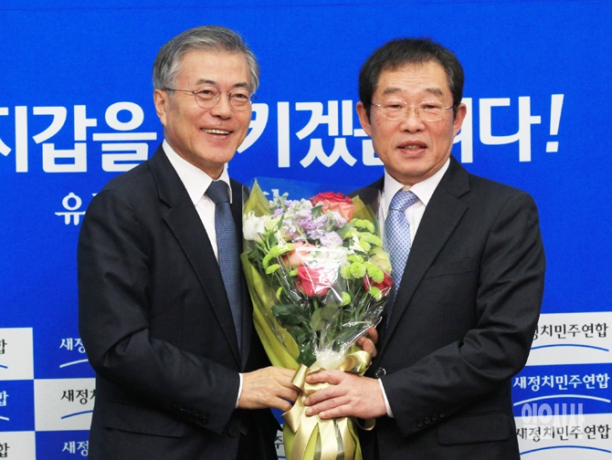 [포토] 꽃다발 건네받는 이용득