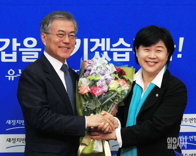 문재인 새정치민주연합 대표가 6일 오전 서울 여의도 국회에서 열린 최고위원회의에 앞서 당 전국여성위원장에 당선된 서영교 의원에게 꽃다발을 건네며 축하하고 있다.
