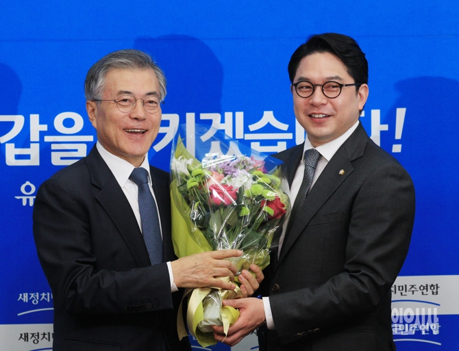 문재인 새정치민주연합 대표가 6일 오전 서울 여의도 국회에서 열린 최고위원회의에 앞서 당 전국청년위원장에 당선된 정호준 의원에게 꽃다발을 건네며 축하하고 있다.