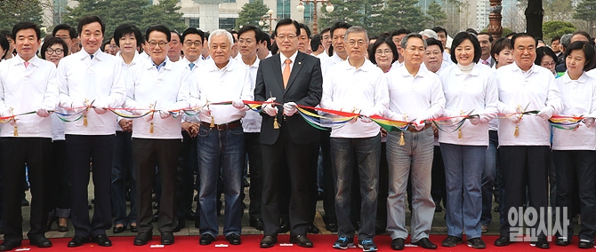 6일, 서울 여의도 국회에서 '새정치 2015 다함께 정책엑스포 테잎 커팅식'이 열린 가운데, 정의화 국회의장, 문재인 대표 , 우윤근 원내대표 등 참석자들이 커팅식을 갖고 있다.