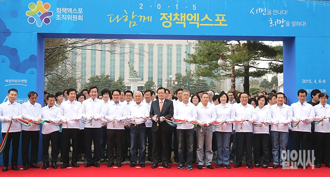 6일, 서울 여의도 국회에서 '새정치 2015 다함께 정책엑스포 테잎 커팅식'이 열린 가운데, 문재인 대표 , 우윤근 원내대표 등 참석자들이 테이프 커팅을 하고 있다.