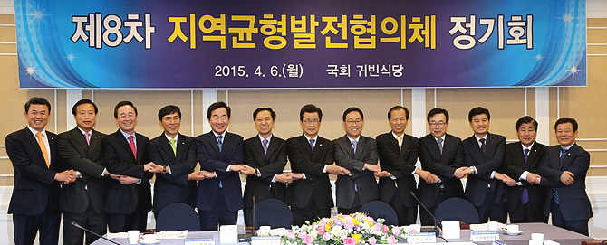 6일, 서울 여의도 국회 귀빈식당에서 최문순 강원도지사 등이 참석, 비 수도권 시도지사 협의회가 열리기 직전, 참석자들이 서로 손을 맞잡고 있다.