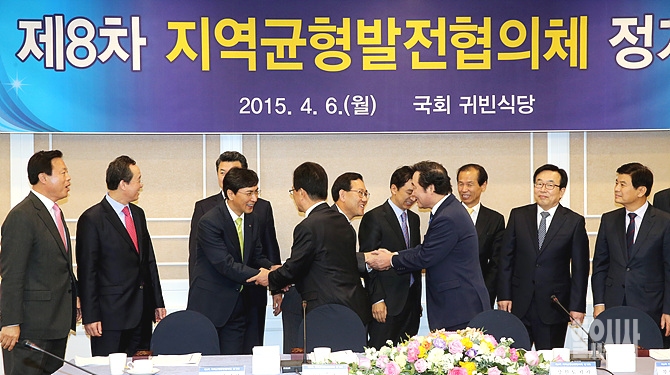 6일, 서울 여의도 국회 귀빈식당에서 최문순 강원도지사, 안희정 충남도지사 등이 참석한 가운데 반가움의 악수를 나누고 있다.