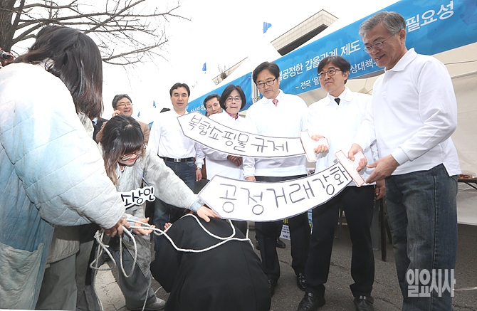 6일, 새정치민주연합 문재인 대표(사진 오른쪽)가 국회서 열린 '2015 다함께 정책엑스포' 도중 '복합쇼핑몰 규제'와 관련해 '공정거래를 강화'해야 한다는 내용의 퍼포먼스를 펼치고 있다.
