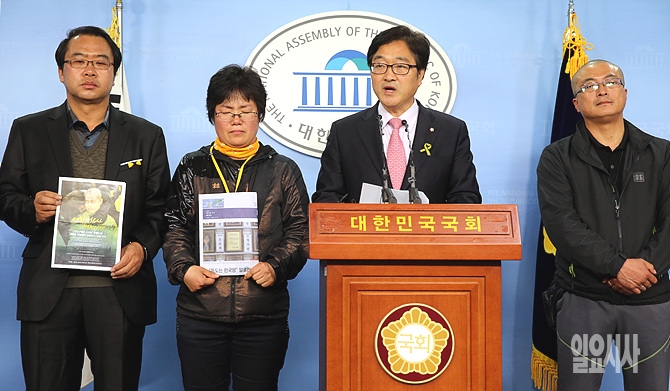 7일, 서울 여의도 국회 정론관에서 새정치민주연합 우원식 의원이 한 세월호 유가족들과 함께 세월호 인양 결의안 촉구 기자회견을 갖고 있다.