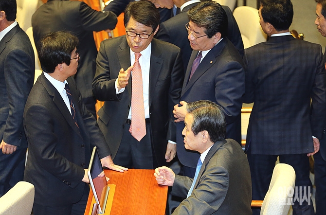 7일, 서울 여의도 국회 본회의장에서 열린 본회의 직전, 이군현-강석호 의원이 이야기를 나누고 있다.