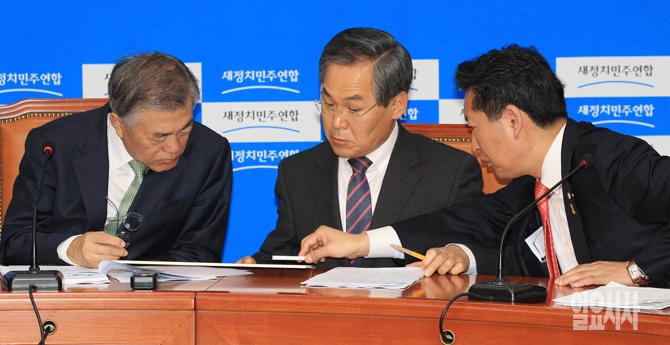 새정치민주연합 문재인 대표, 우윤근 원내대표, 정청래 최고위원이 8일 오전 서울 여의도 국회에서 열린 최고위원회의에서 머리를 맞대고 논의하고 있다.