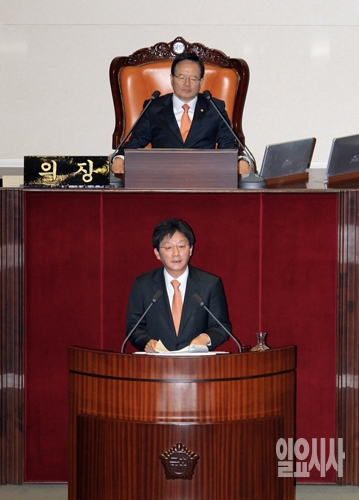 새누리당 유승민 원내대표가 8일 오전 국회 본회의에서 교섭단체 대표연설을 하고 있다.