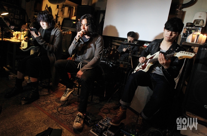 배우 겸 가수 최민수가 속한 밴드 36.5℃가 8일 오후 서울 마포구 합정동 트라이브바에서 열린 '말하는개' 발매 기념 쇼케이스에서 공연을 펼치고 있다.