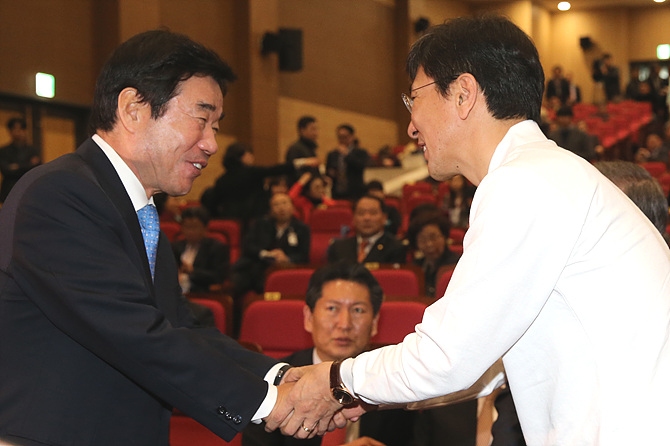 8일, 서울 여의도 국회서 열린 새정치민주연합 '다함께 정책엑스포' 폐막식서 안희정 충남도지사가 김진표 정책엑스포 조직위원장과 악수를 나누고 있다.