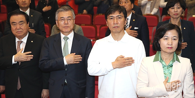 8일, 서울 여의도 국회서 열린 새정치민주연합 '다함께 정책엑스포' 폐막식에서 문재인 대표(사진 왼쪽서 두 번째), 문희상 전 비상대책위원장(사진 왼쪽), 안희정 충남도지사(사진 오른쪽서 두 번째) 등이 국기에 대한 경례를 하고 있다.