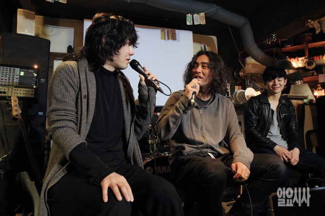 밴드 36.5℃에 속한 배우 겸 가수 최민수가 김장훈과 함께 8일 오후 서울 마포구 합정동 트라이브바에서 열린 '말하는개' 발매 기념 쇼케이스에서 신곡을 소개하고 있다.