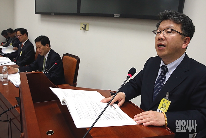 8일, 서울 여의도 국회서 열린 서민주거 특별위원회 전체회의 도중, 한 참석자가 경과보고를 하고 있다.
