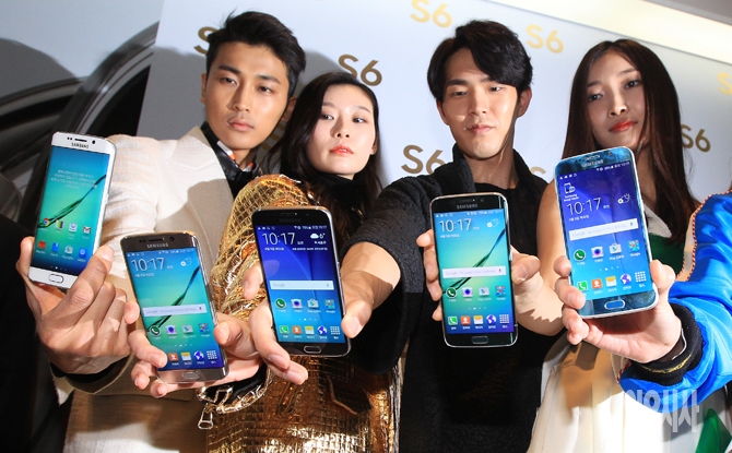 갤럭시 S6 국내 출시를 하루 앞둔 9일 오전 서울 삼성전자 서초사옥 다목적홀에서 열린 'S6 월드투어 서울' 행사에서 모델들이 갤럭시S6와 갤럭시S6엣지를 들고 포즈를 취하고 있다.